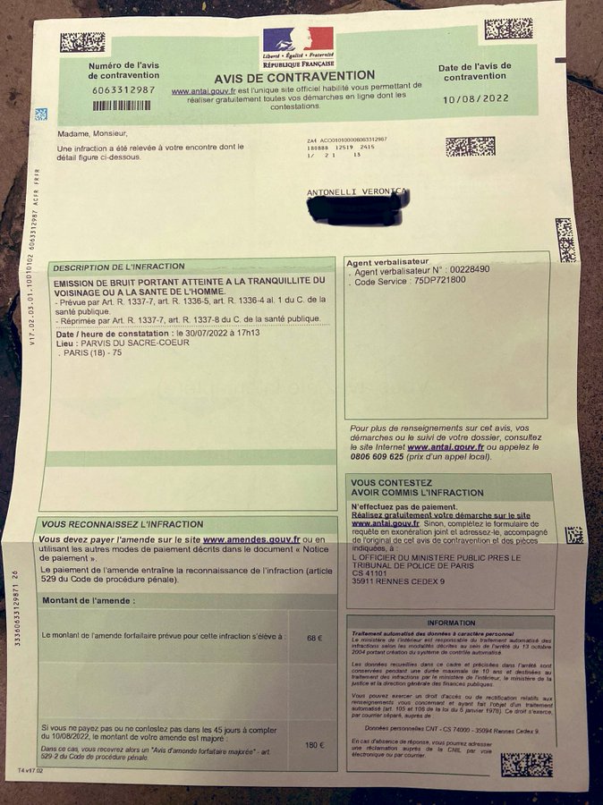 Les motifs de la contravention sont un émerveillement, car réussir à nous expliquer qu’une cantatrice à Montmartre, lieu blindé de touristes, oui il y a des aventuriers, trouble la tranquillité et la santé des habitants est un triomphe de la pensée psychique, un rêve enchanté, une œuvre d’art d’exception !