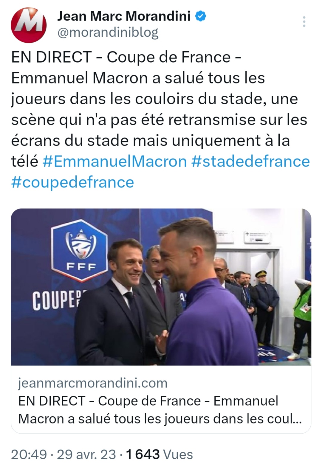L’opération “cartons et sifflets” n’a peut être pas été couronnée de succes, mais pour ce qui me concerne cela a été très positif. En effet, rien que de voir la gueule que tirait durant le match le MACRON qui ne pouvait cacher une grande trouille certaine, j’ai trouvé ça JOUISSIF ! d’ailleurs, “IELLE”, avec ses grandes qualités maternelles l’encourageait souvent de quelques mots susurrés à l’oreille ! Le mec qui se qualifie lui-même de “tueur” n’en menait pas large. Et je pense qu’il n’a encore rien vu !