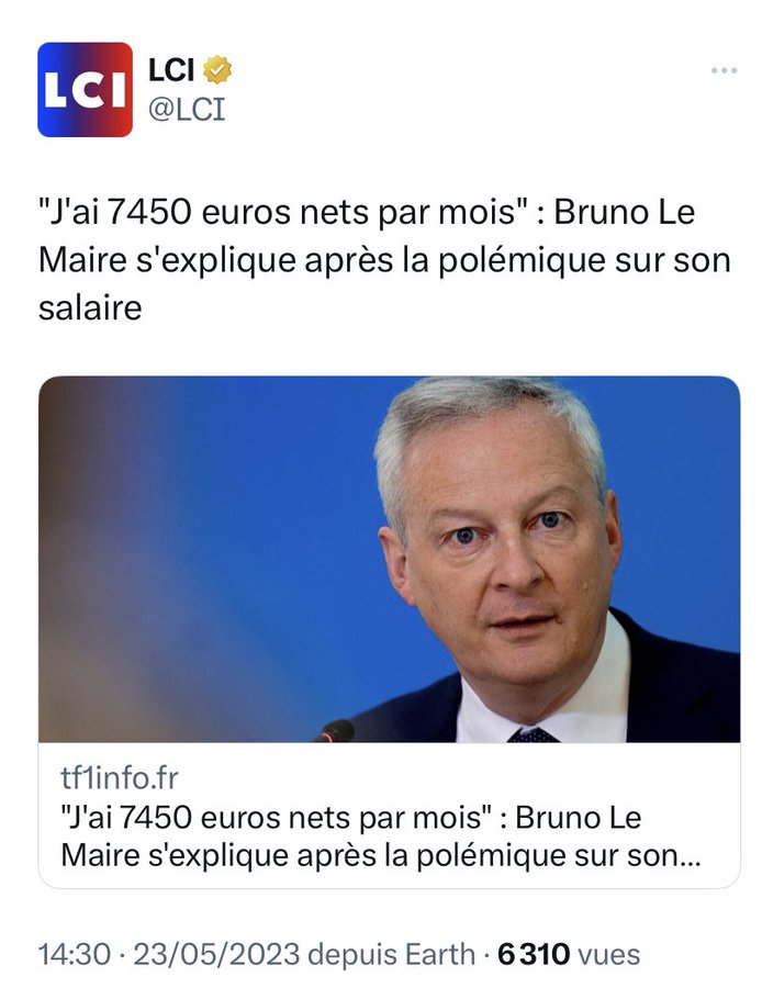 🗣️ @BrunoLeMaire : "Bien sûr que non les fins de mois d'un ministre ne sont pas les mêmes que celles de quelqu'un qui touche 1.200/1.300 €/mois. Je vois des chiffres qui sont faux. J'ai 7.450 € net/mois une fois les impôts déduits."